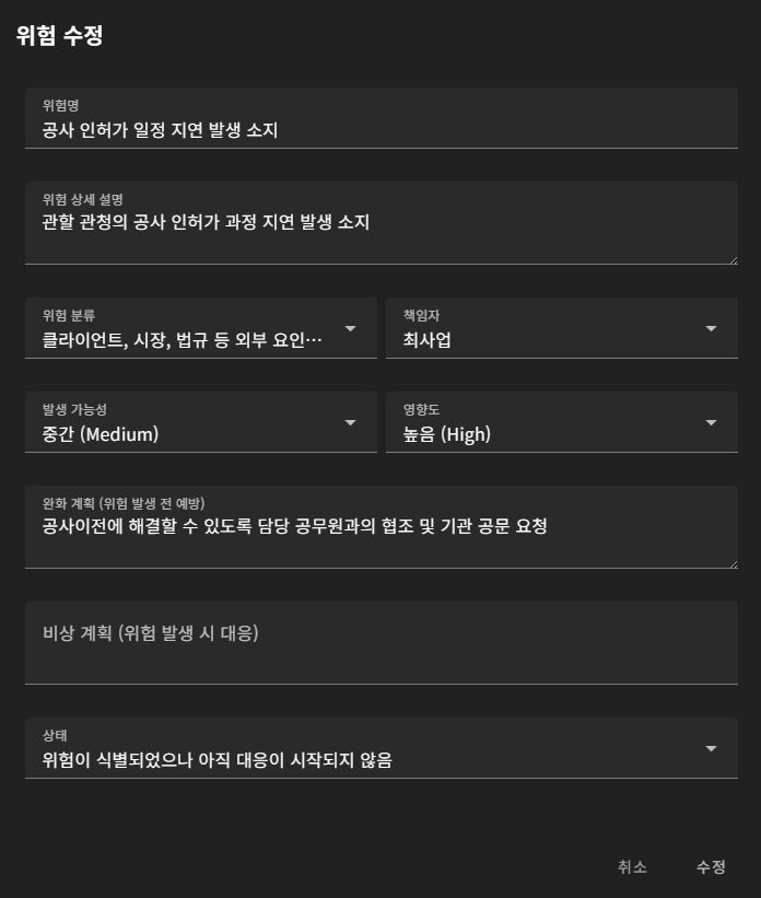 - 비상계획 : 위험이 발생할때 수행할 과정을 등록합니다. 예를 들어, "인허가가 늦어질 경우 발주처 담당자에 연락 공사 일정 변경 진행함" 등으 수행 절차를 의미할 수 있습니다.