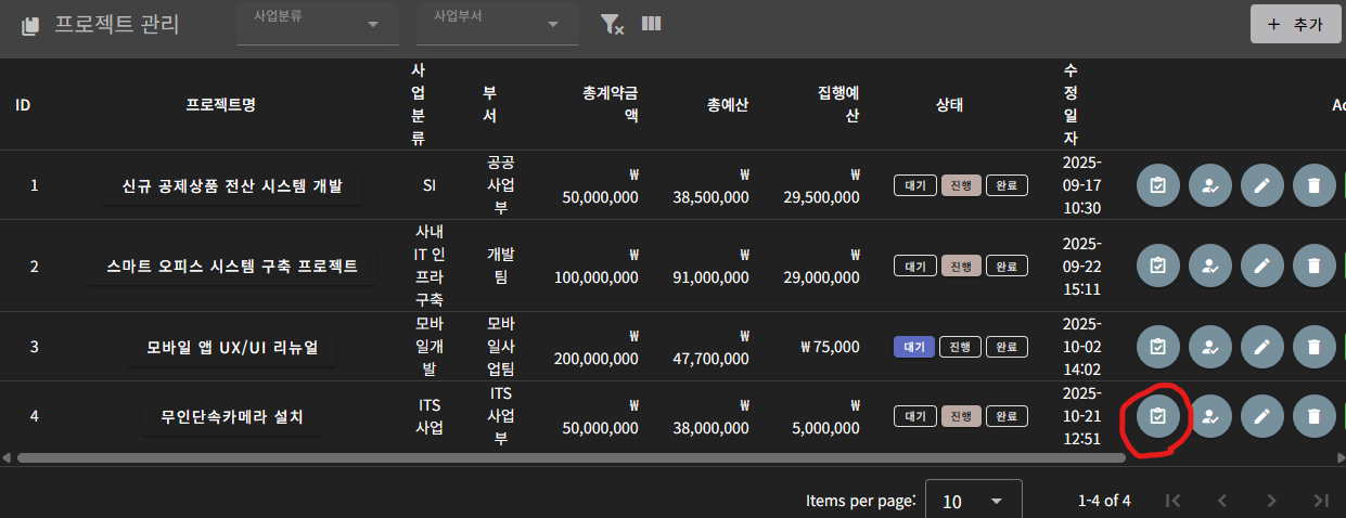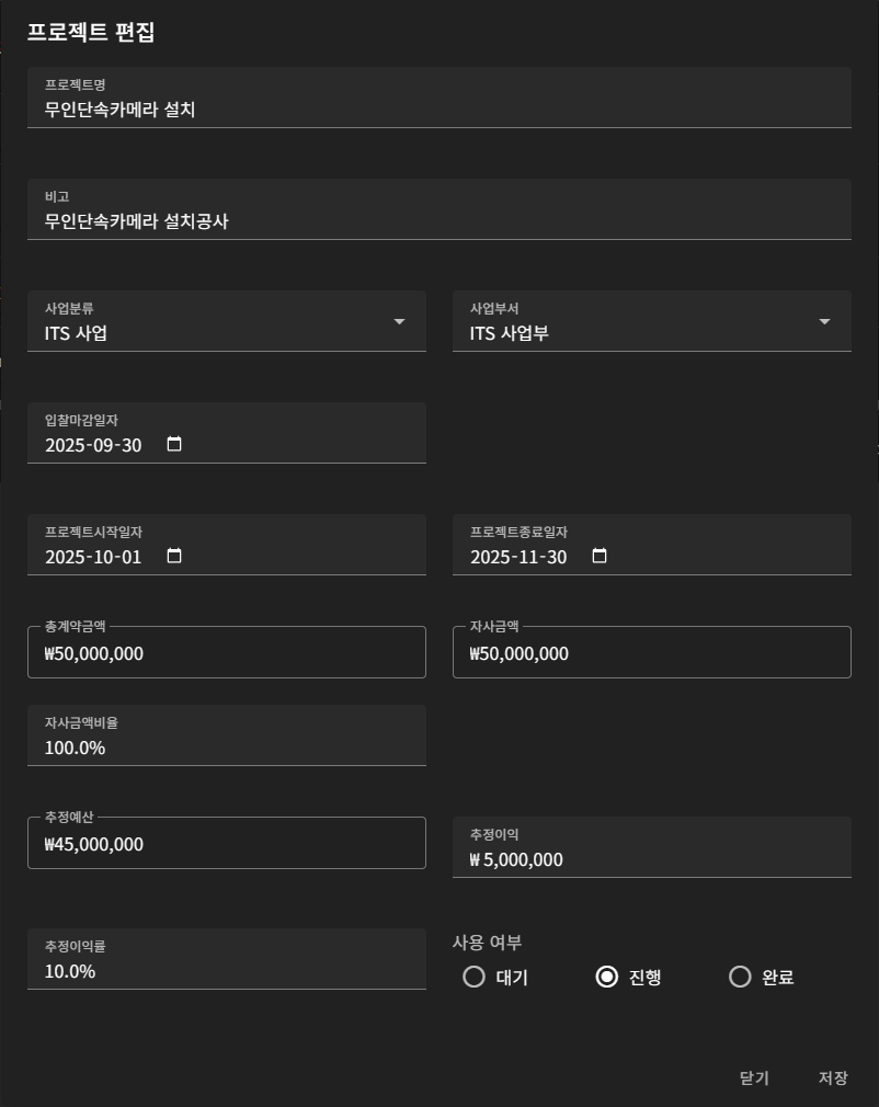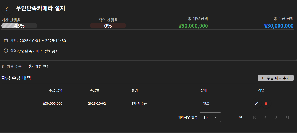 프로젝트 명칭을 클릭하면 해당 프로젝트의 상세정보와 수금 일정 및 프로젝트 위험관리를 진행할 수 있습니다.