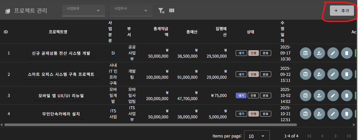 '프로젝트 정보관리' 메뉴에서 프로젝트 추가를 선택합니다.